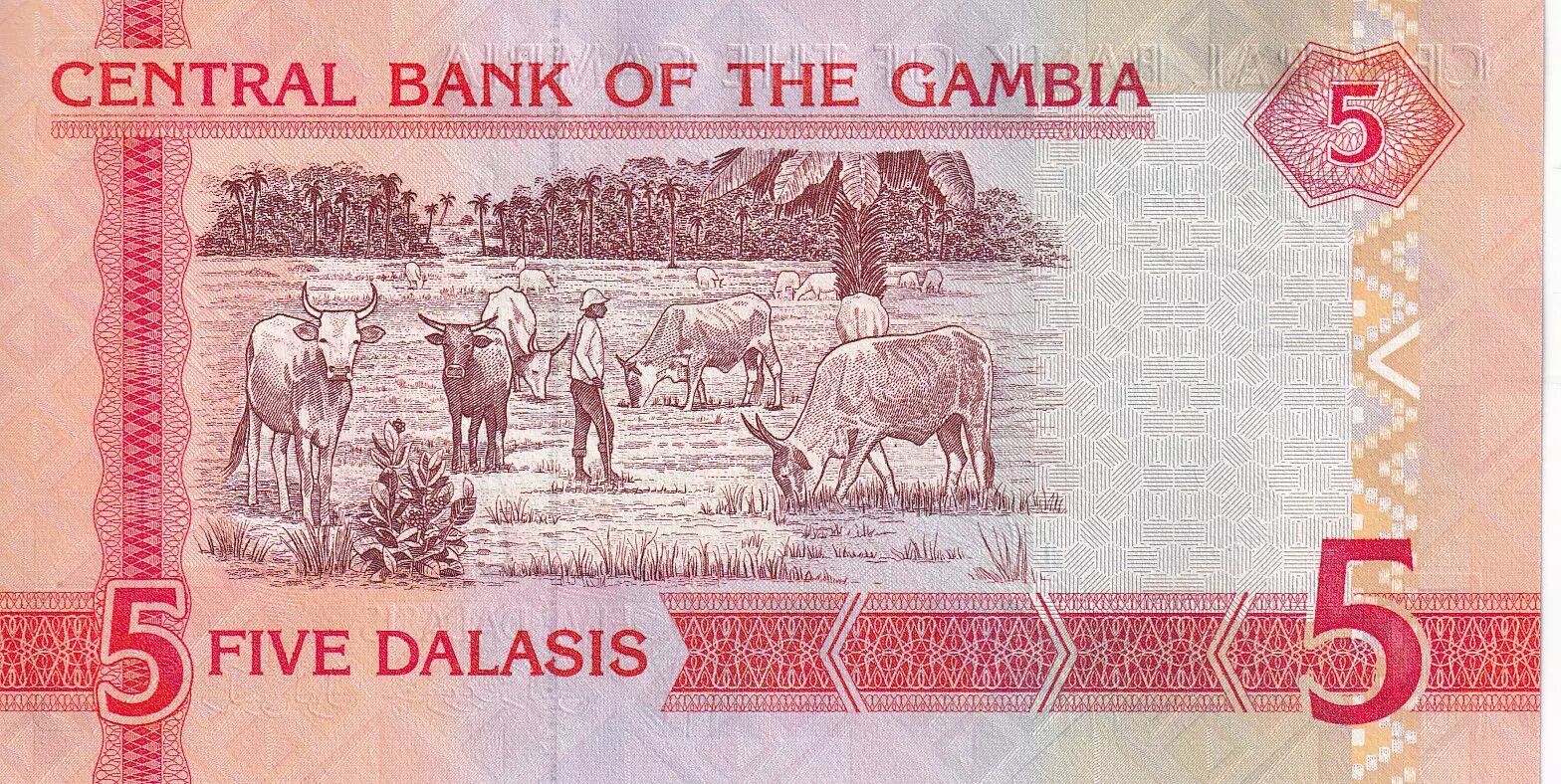 Billet Gambie 5 Dalasis - Oiseau - Vaches - ND (2013) - P.25c