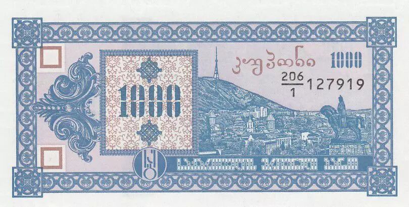 Au recto du billet, on peut voir une représentation du Mont Tatzminda. Le nom de la banque émettrice n'est pas mentionné directement sur le billet, mais il est implicite qu'il s'agit de la Banque Nationale de Géorgie, l'institution responsable de l'émission de la monnaie nationale. La valeur nominale de 1000 kuponi est imprimée en chiffres dans les coins supérieurs gauche et droit, ainsi qu'en toutes lettres dans la langue du pays.
