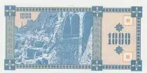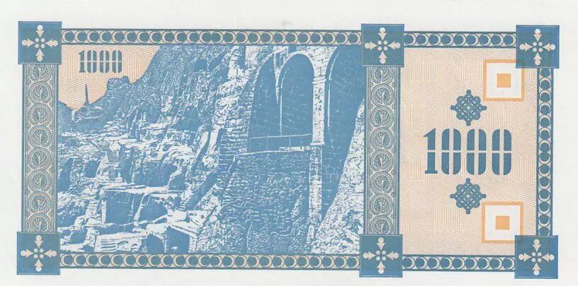 Le verso du billet reprend le thème du paysage géorgien, avec une autre vue du Mont Tatzminda. La valeur nominale de 1000 kuponi est également répétée au verso, à la fois en chiffres et en lettres. Le billet comporte des éléments de sécurité, bien que ceux-ci ne soient pas spécifiés en détail dans les informations fournies. Il est important de noter que ce billet date d'une période de transition économique en Géorgie, marquée par l'hyperinflation et l'introduction du kuponi comme monnaie temporaire avant d'être remplacée par le lari.
