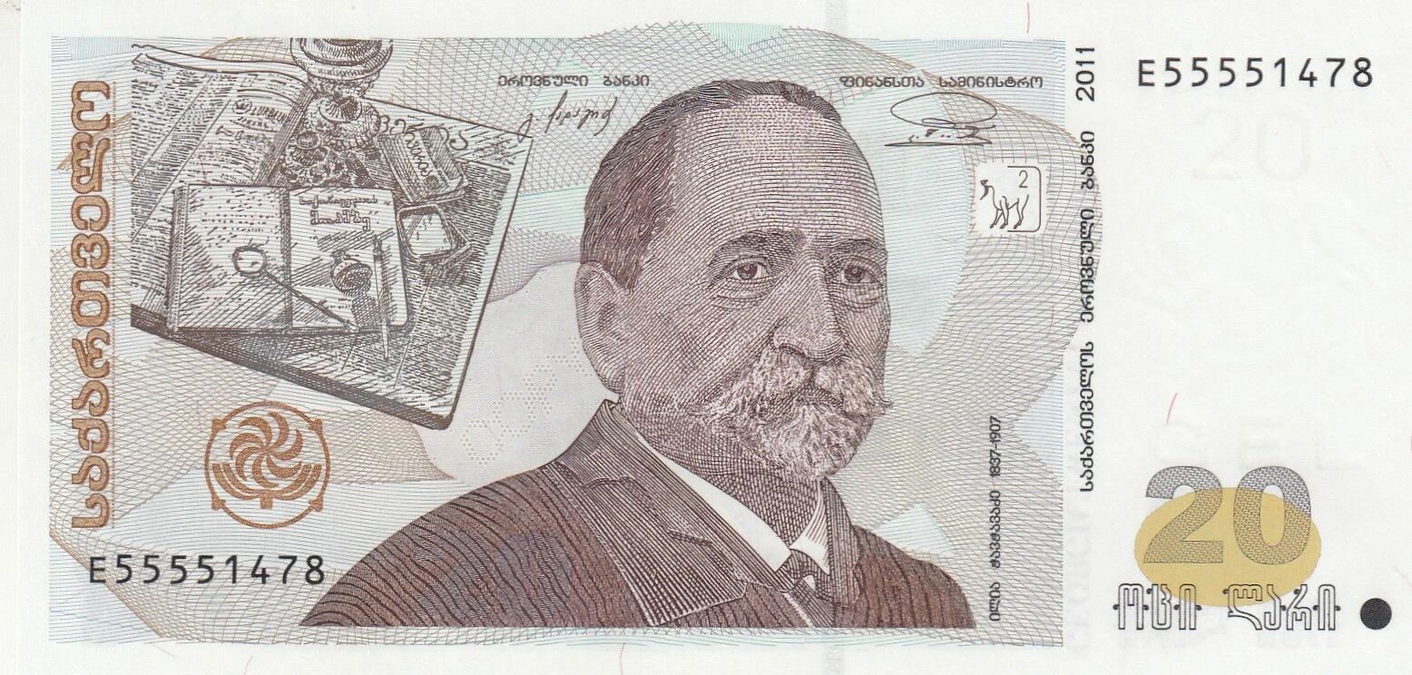 Sur le recto du billet, on retrouve le portrait d'Ilia Chavchavadze, une figure marquante de la littérature et du mouvement national géorgien au XIXe siècle. À côté de son portrait figurent des extraits de ses ?uvres littéraires, calligraphiés en alphabet géorgien. Ces éléments mettent en évidence son rôle crucial dans la renaissance culturelle et intellectuelle de la Géorgie. En arrière-plan, des motifs ornementaux traditionnels géorgiens complètent le design.