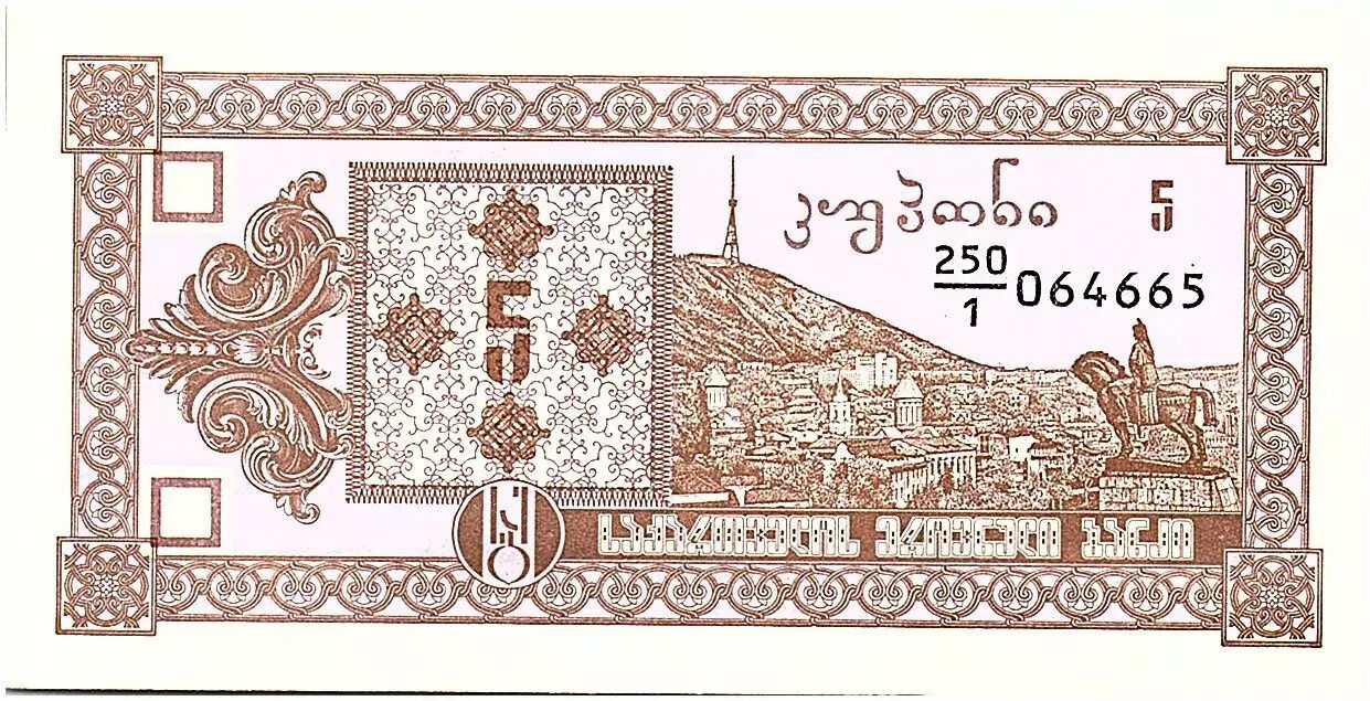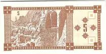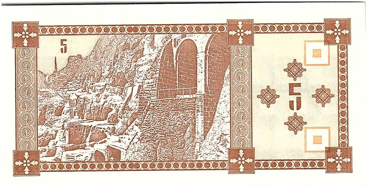 Le recto du billet présente une composition graphique où le motif principal est le Mont Tatzminda. Les inscriptions incluent la valeur nominale du billet, exprimée en chiffres et en lettres. On y trouve également des éléments décoratifs et des motifs géométriques qui encadrent la scène centrale.