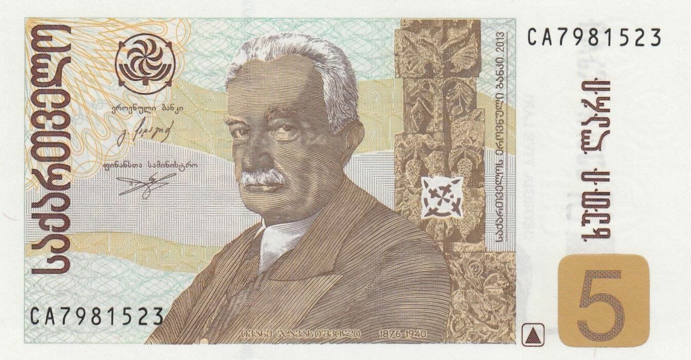 Le billet de 5 lari, émis entre 2002 et 2013, fait partie de la série CA. Ce billet rend hommage à Ivane Javakhishvili, une figure marquante de l'histoire académique géorgienne.
