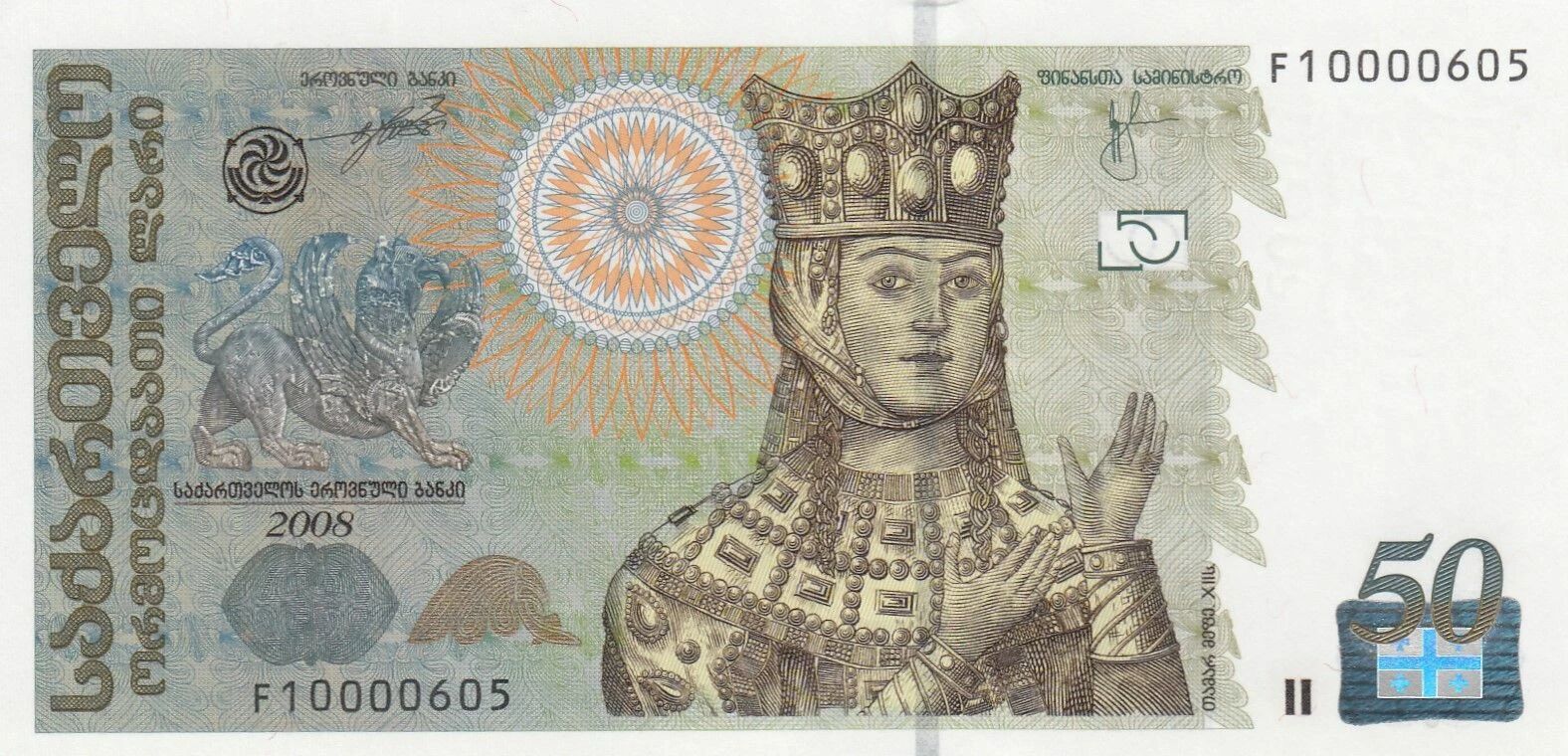Le billet de 50 lari géorgien, émis entre 2004 et 2013, rend hommage à la Reine Tamar de Géorgie. Ce billet fait partie de la série F.