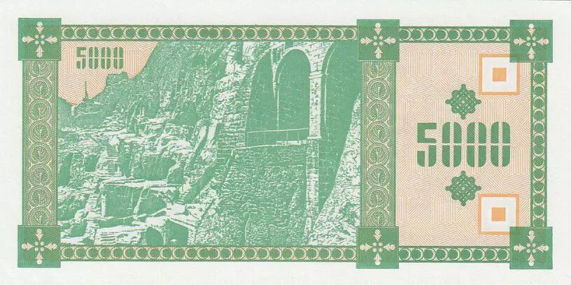 Au verso, on retrouve une représentation stylisée d'un paysage géorgien. La valeur nominale du billet est également indiquée, tant en chiffres qu'en lettres, avec des inscriptions supplémentaires en langue géorgienne. Des motifs ornementaux similaires à ceux du recto sont présents, assurant une cohérence visuelle entre les deux faces.