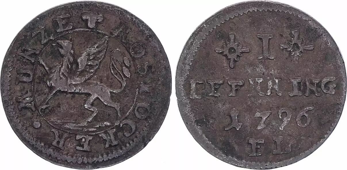 Home > World Coins > European Currencies > Germany - German States > Germany 1 Pfenning , Rostock - 1796 FL