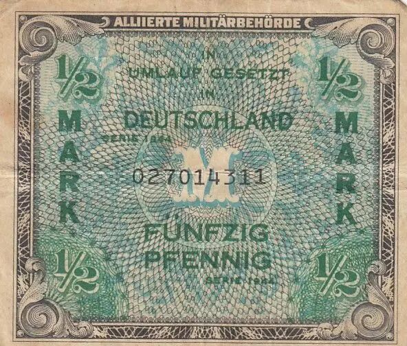 Banknote Germany 1/2 Mark - AMC, blue on lt blue - 1944 - 9 digit with F - F - P.191a