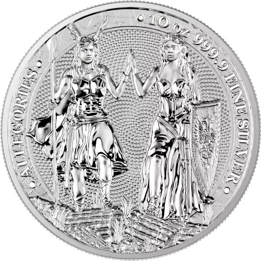 The Allegories coins are created in a diameter of 38 61 mm and four different thicknesses and weights from 3 mm for the 1 oz coin to 25 85 mm for the 10 oz coin which is exceptional not only because of its thickness but also because the blanks from which it was struck were processed by hand.