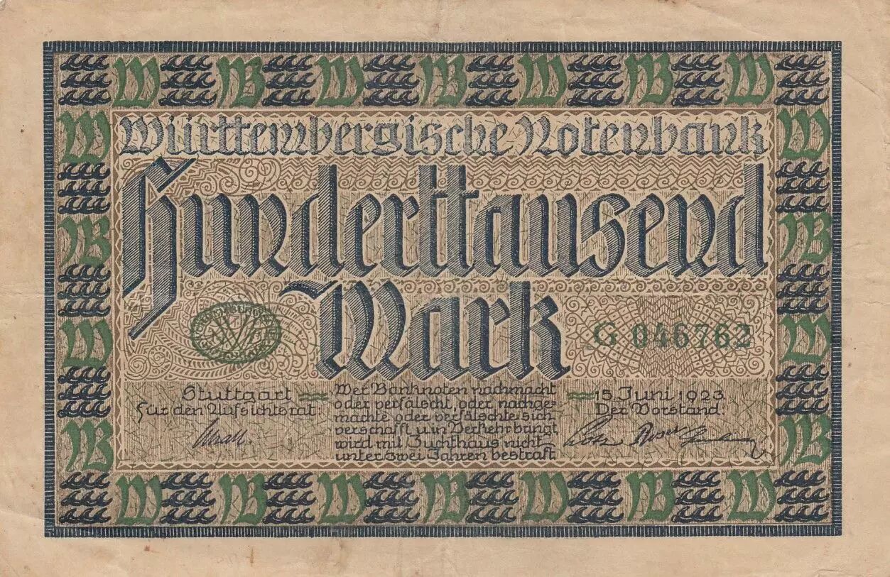 Banknote Germany 100 000 Mark - City of Wurttemberg - Serial G - 1923