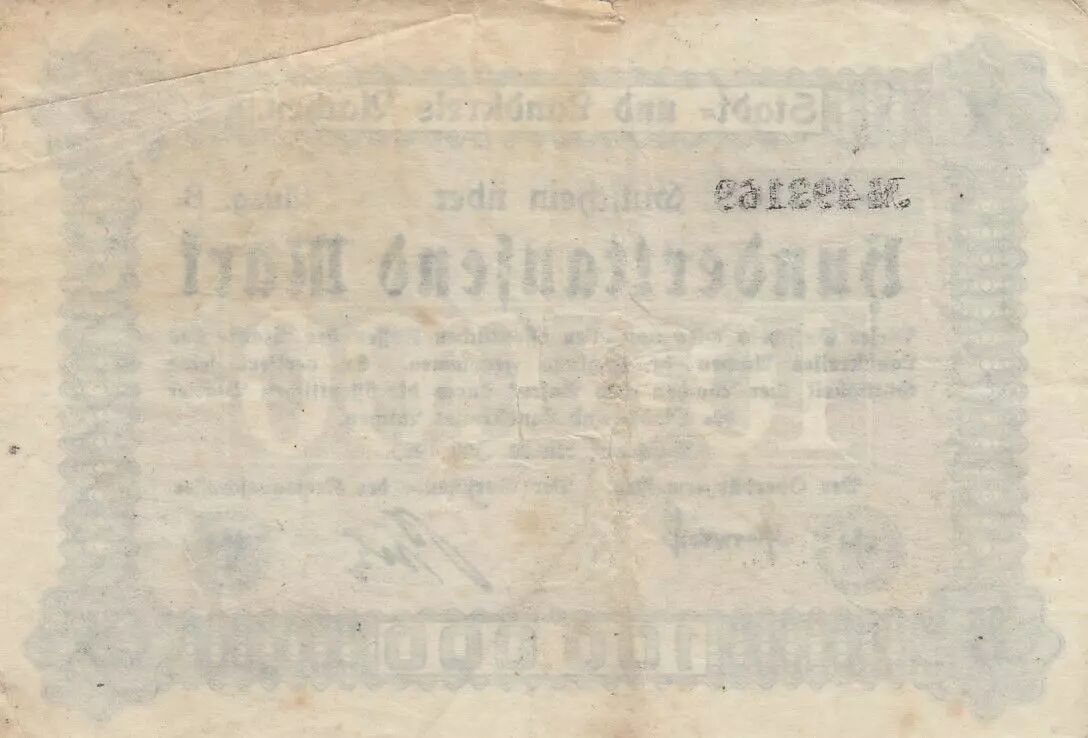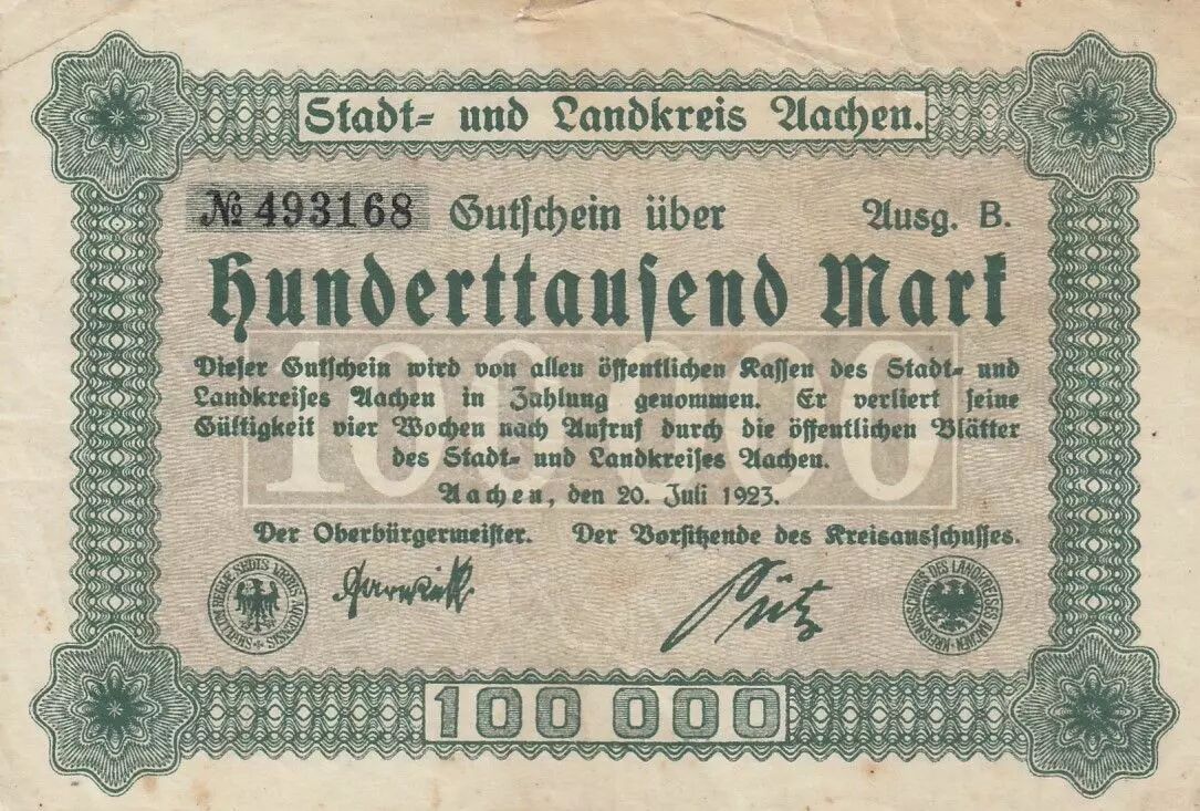 Banknote Germany 100 000 Mark - State of Aachen - Number 493168 - 1923