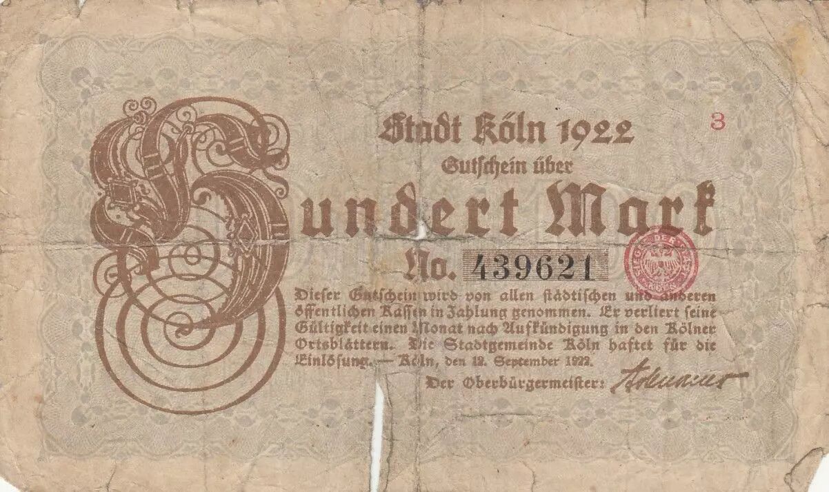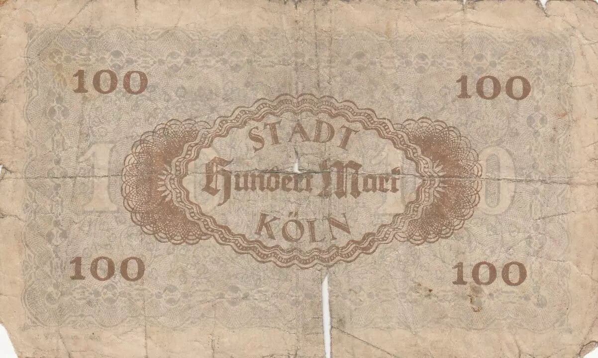 Banknote Germany 100 Mark - City of Koln - Number 439621 - 1922