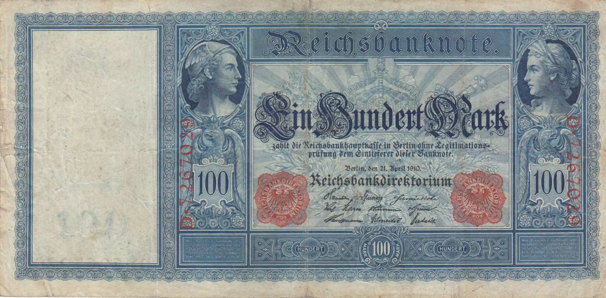Home > World Banknotes > European Banknotes > Germany - German States > Germany > Germany 100 Mark - Mercure et Cérès - 21-04-1910 - Serial D