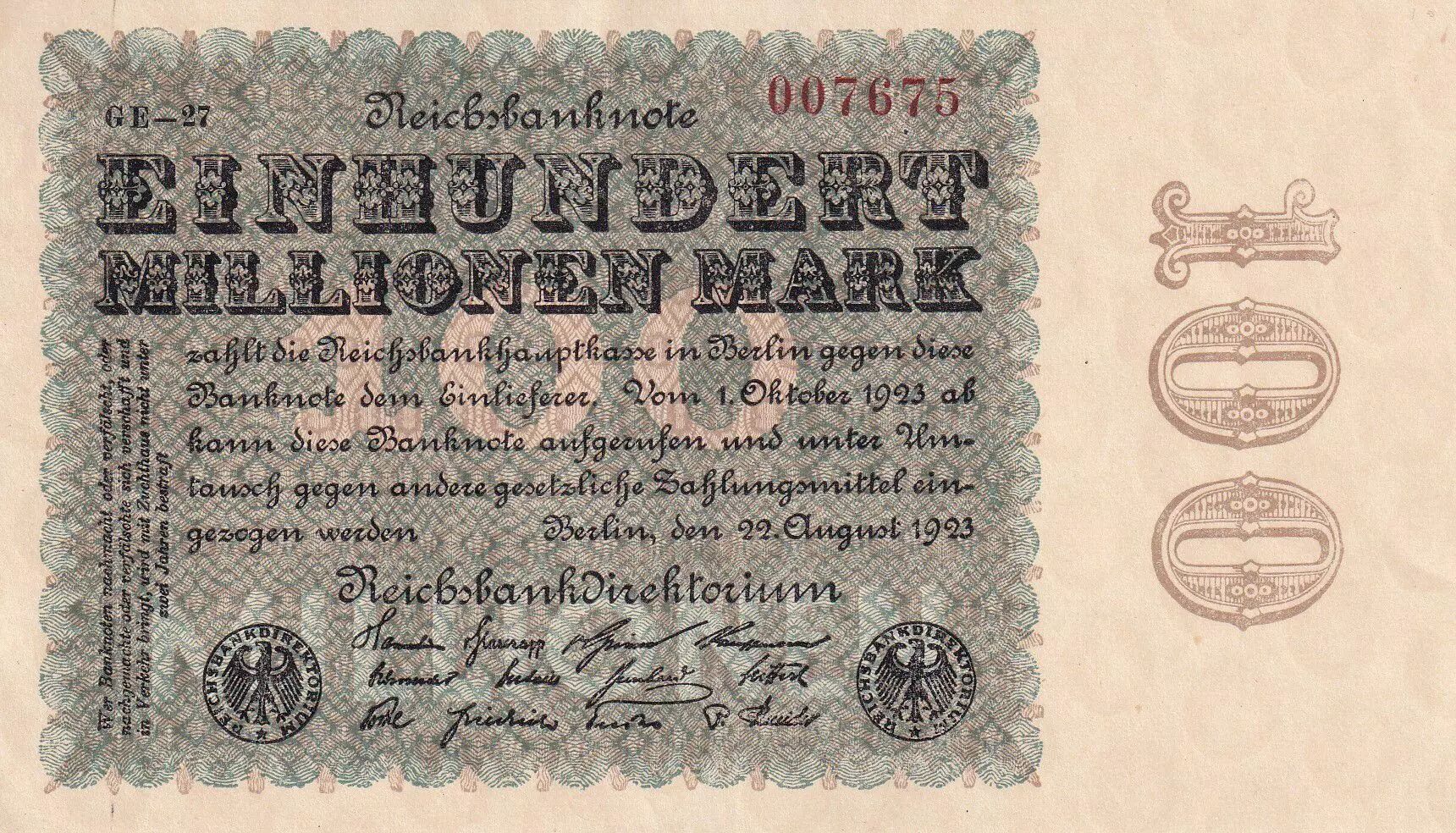 Banknote Germany 100 Millionen Mark - Blue & Green - 1923 - Varieties watermarks and serials - XF - P.107