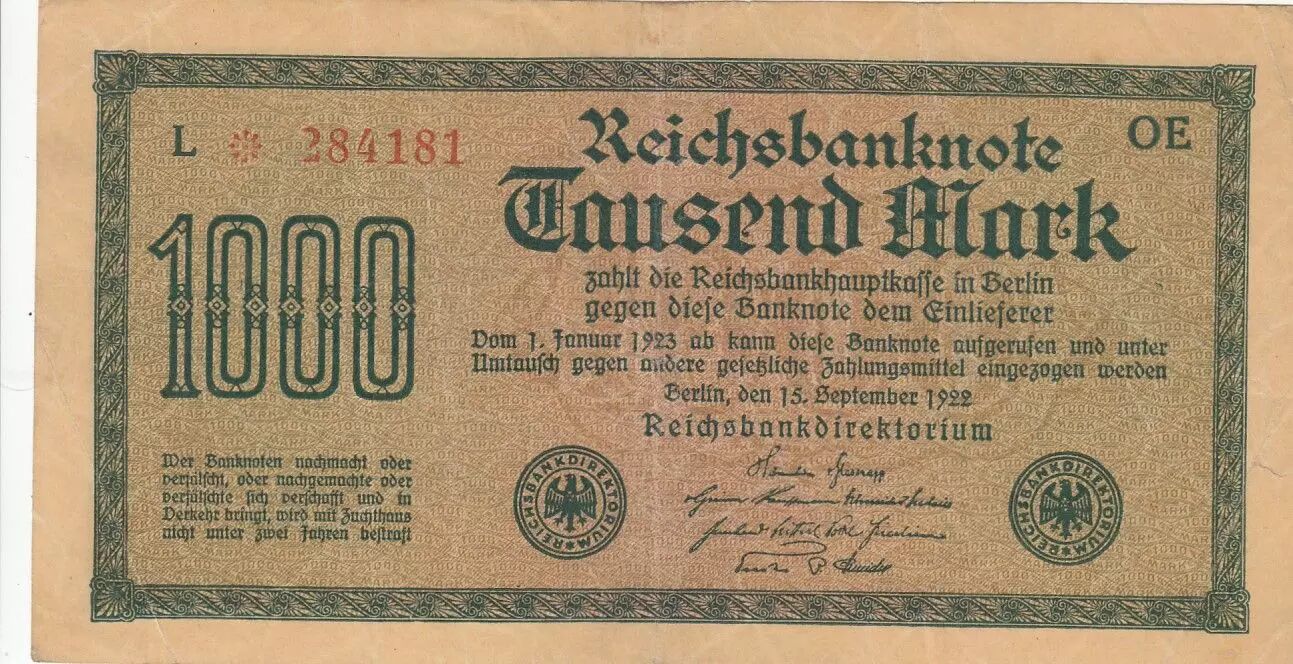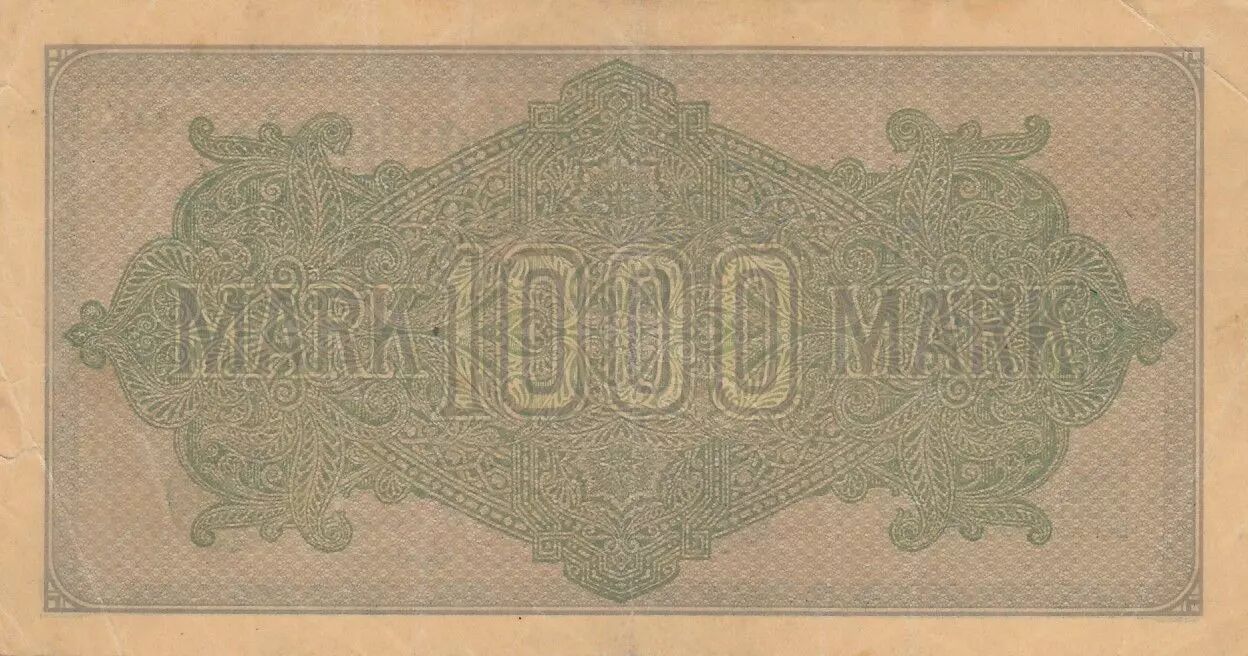 Home > World Banknotes > European Banknotes > Germany - German States > Germany > Germany 1000 Mark Dk green on green and lilac - 1922 - serial L*-OE