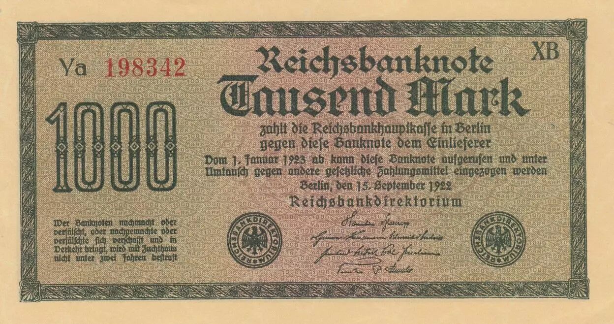 Banknote Germany 1000 Mark Dk green on green and lilac - 1922 - serial ya-xb