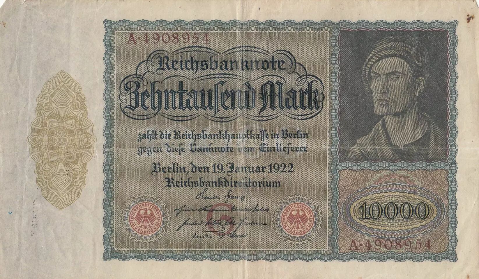 Home > World Banknotes > European Banknotes > Germany - German States > Germany > Germany 10000 Mark - Portrait of man by Durer - 1922 - Varieties Serials and letters