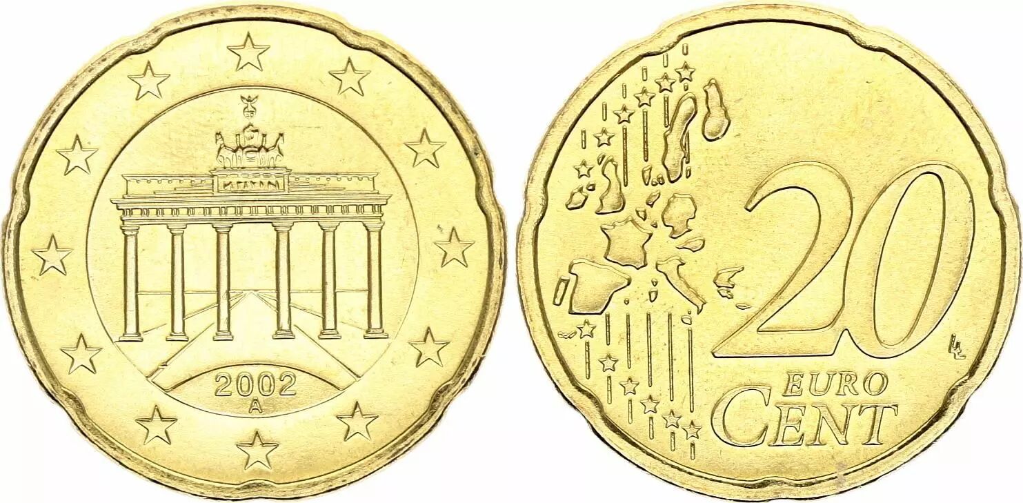 This coin has a face value of 20 euro cents. The issuing country is Germany. It was minted in 2002 by mint A, which corresponds to the Berlin mint.
