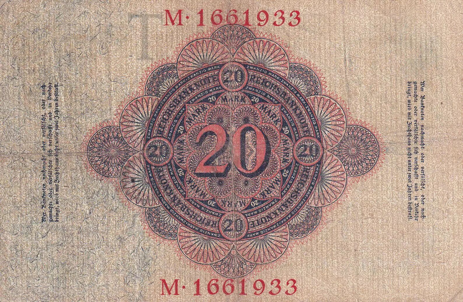 Banknote Germany 20 Mark - Arms - 1914 - Serial M - P.46b