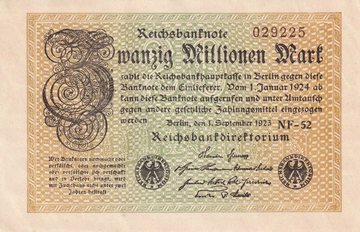 Home > World Banknotes > European Banknotes > Germany - German States > Germany > Germany 20 Millionen Mark - Olive & Brown - 1923 - Varieties watermarks and serials - XF - P.108