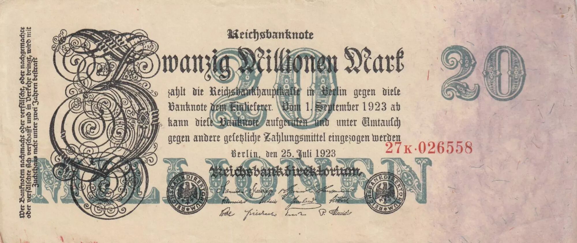 Banknote Germany 20 millionen mark - Reichsbanknote - Serial 27K - 1923