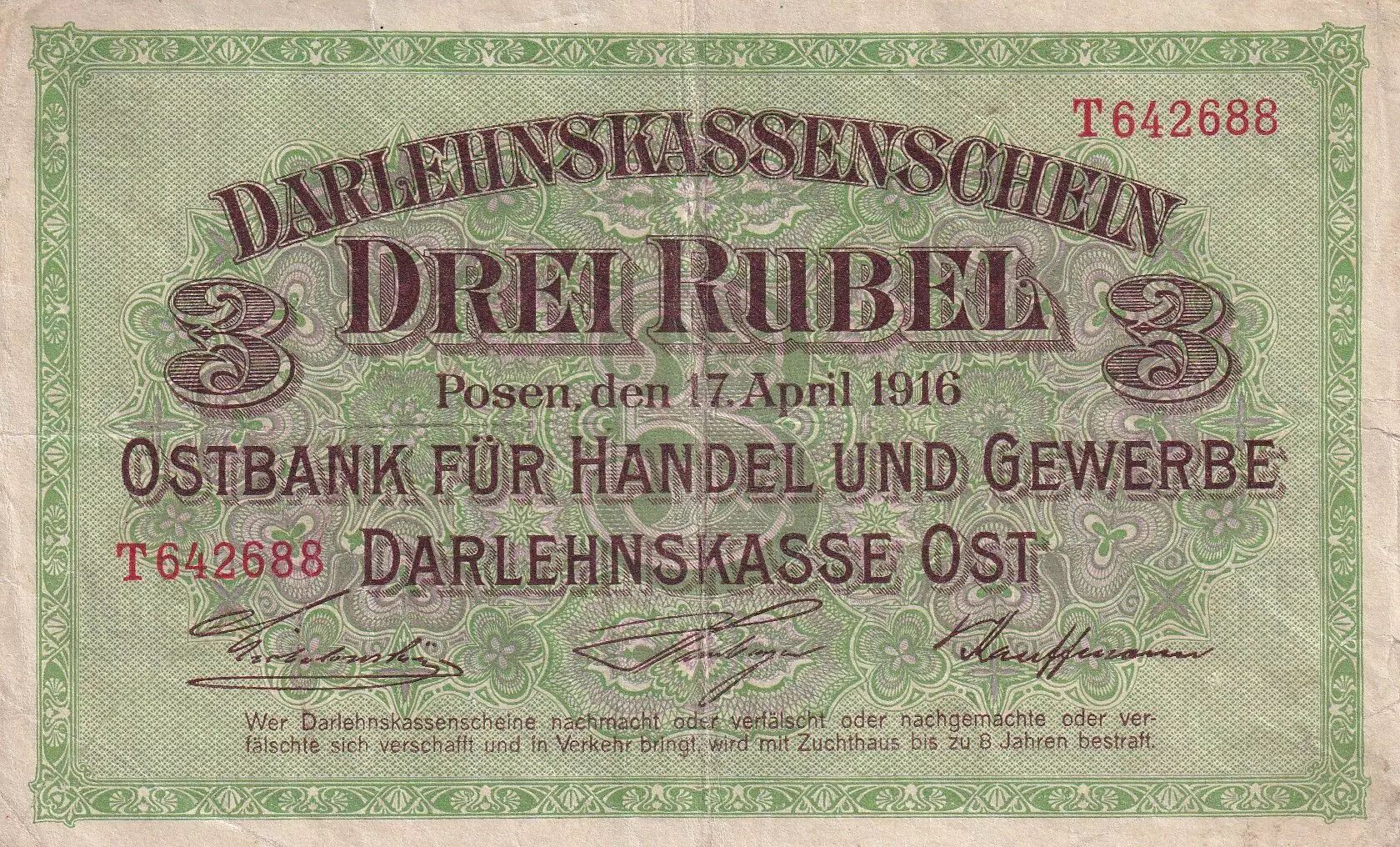 Banknote Germany 3 Rubles - Posen - 1916 - Serial T - P.R123