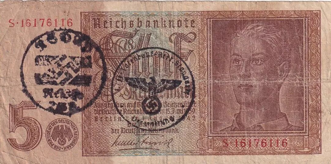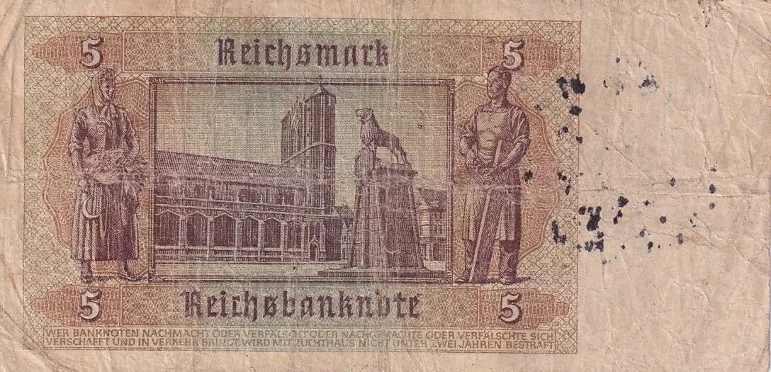 Banknote Germany 5 Mark - Lion's monument - WWII propanganda stamp - 1942