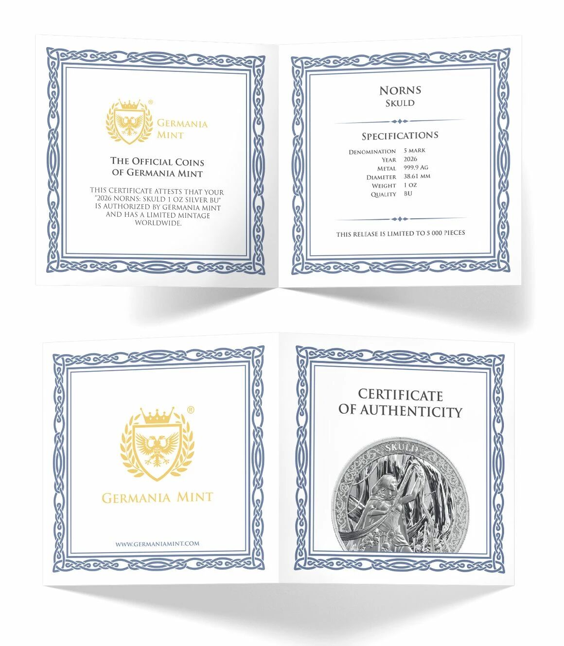 The coin's design features the character of Shuld, one of the Norns. The Norns are figures from Norse mythology, often associated with destiny. Shuld is specifically linked to the future, weaving the threads of destiny to come.