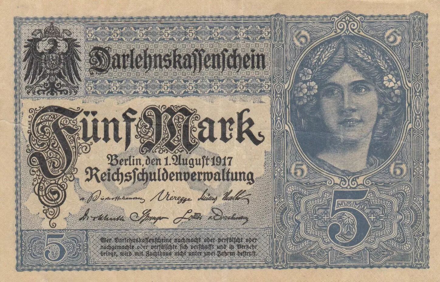 Home > World Banknotes > European Banknotes > Germany - German States > Germany > Germany 5 Mark - Woman, crown - 1917 - Serial O - P.56b