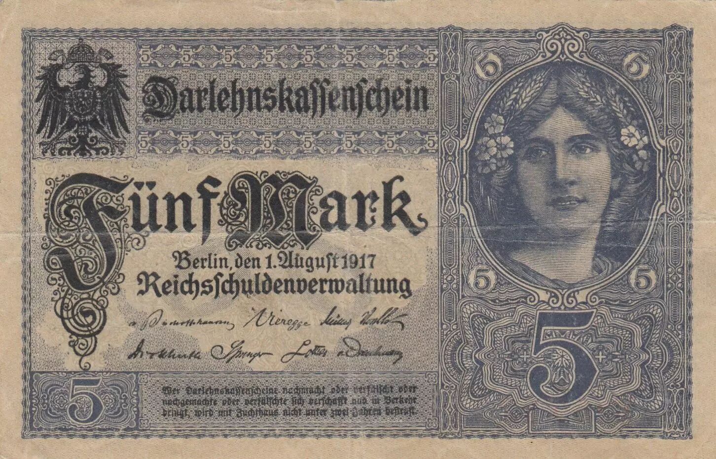 Banknote Germany 5 Mark - Woman, crown - 1917 - Serial R - P.56b