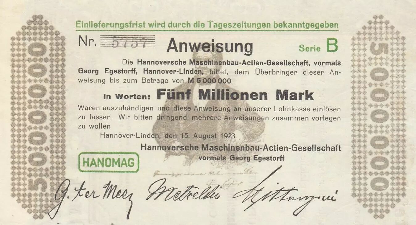 Banknote Germany 5 millionen Mark - State of Hannover-Linden - 1923 - Number 5757