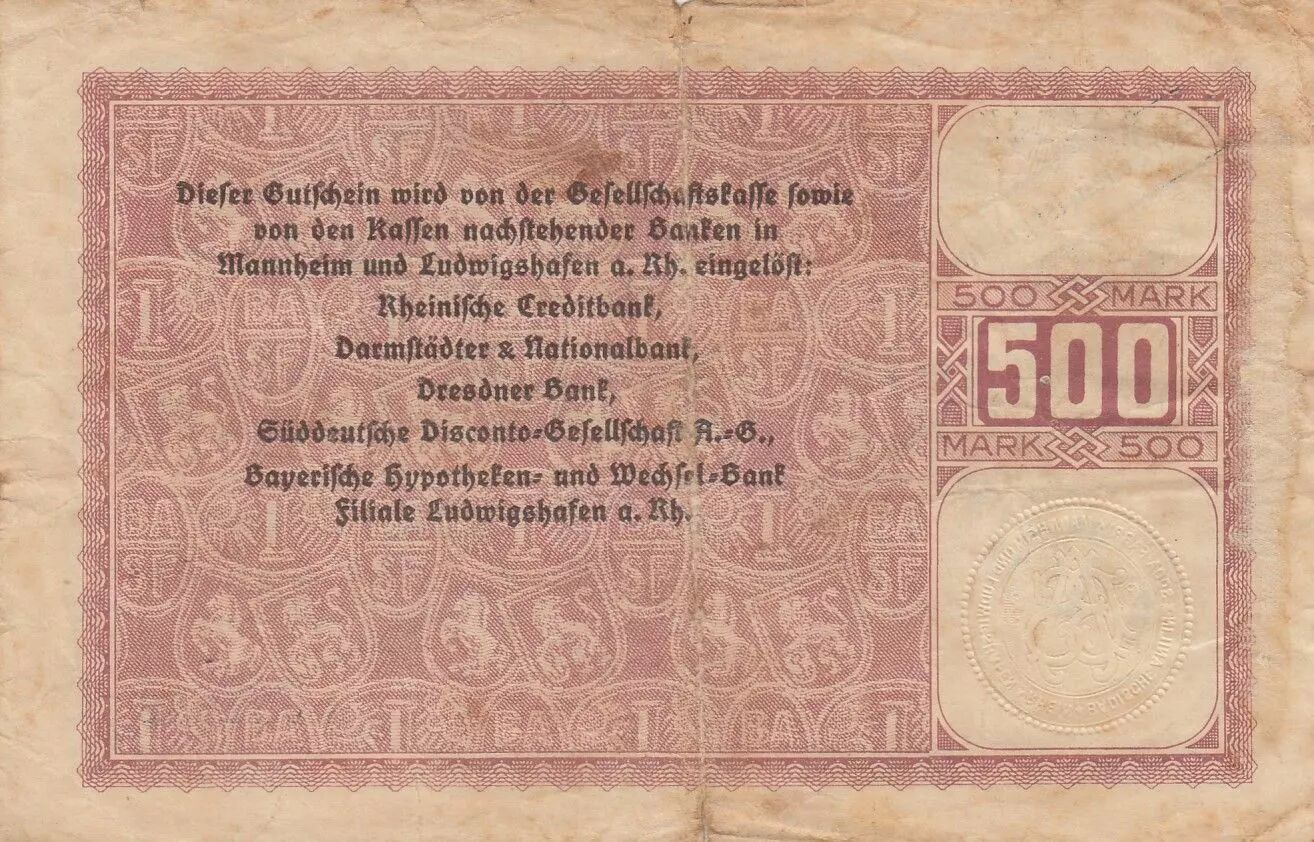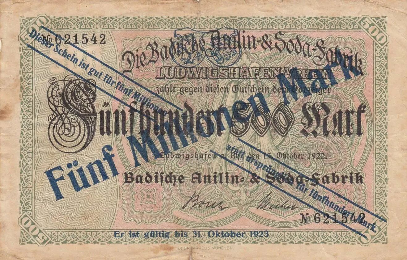Banknote Germany 5 millionnen mark - Aniline and Soda Fabrik - Number 621542 - 1922