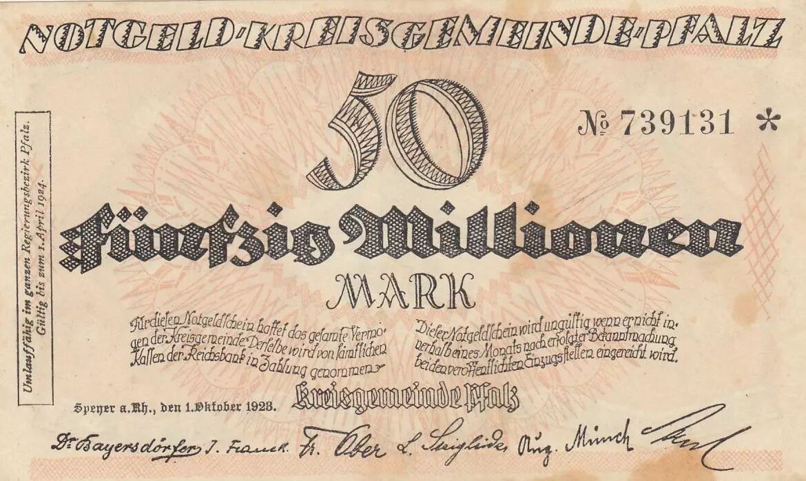 Banknote Germany 50 millionen Mark - City of Pfalz - Number 739131 - 1923