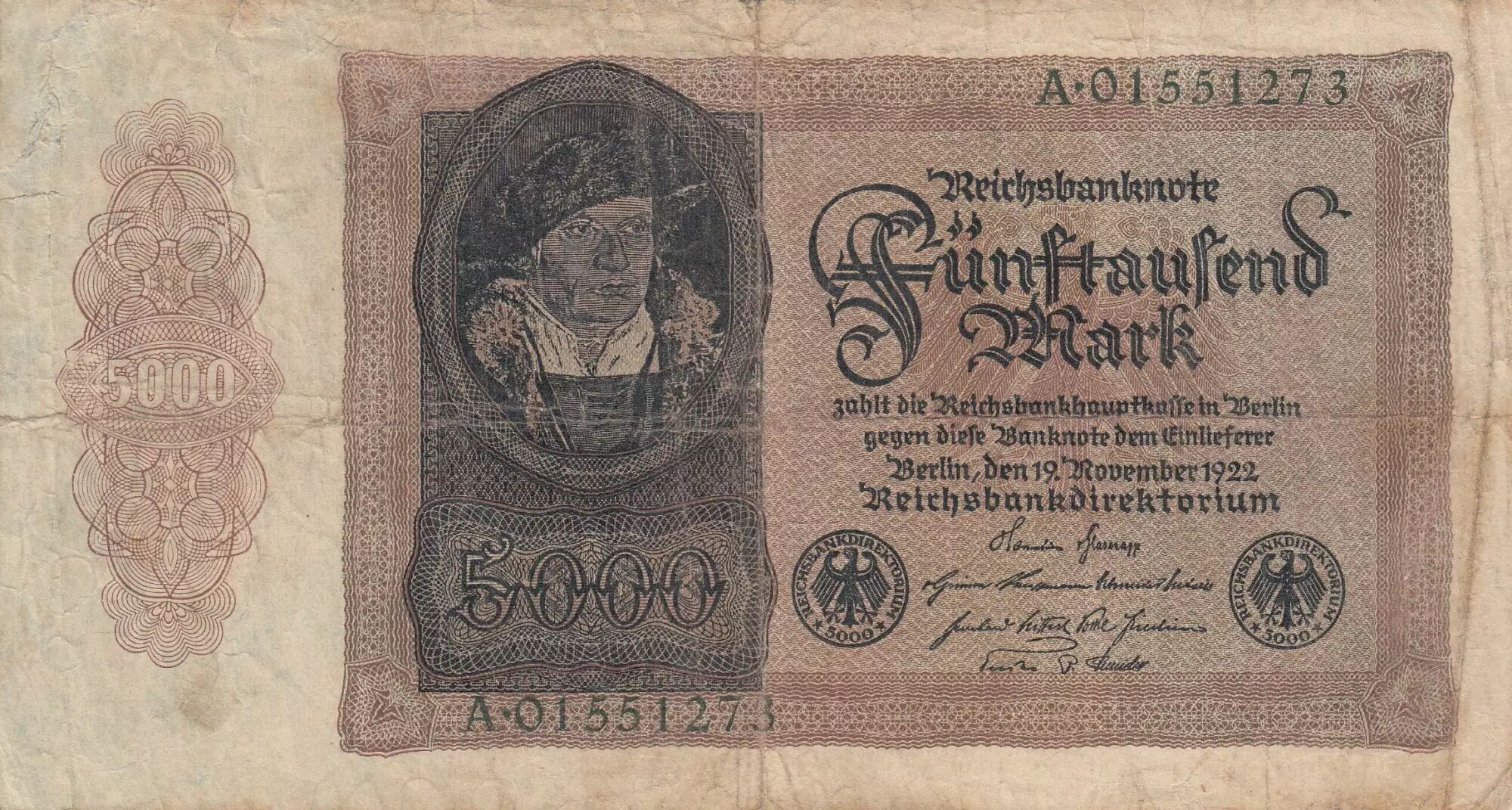 Banknote Germany 5000 mark - Reichsbanknote - Chamberlain H. Urmiller - Serial A.01 - 1922