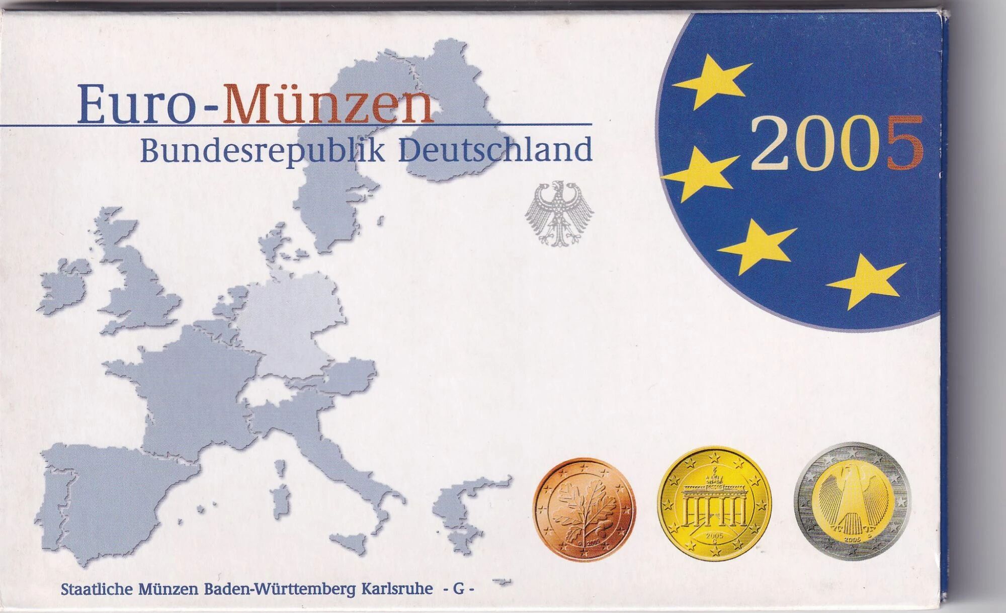 This numismatic set contains the complete series of euro coins from Germany, ranging from 1 cent to 2 euros, minted in Proof (BE) quality by mint G. The year of issue is 2005.