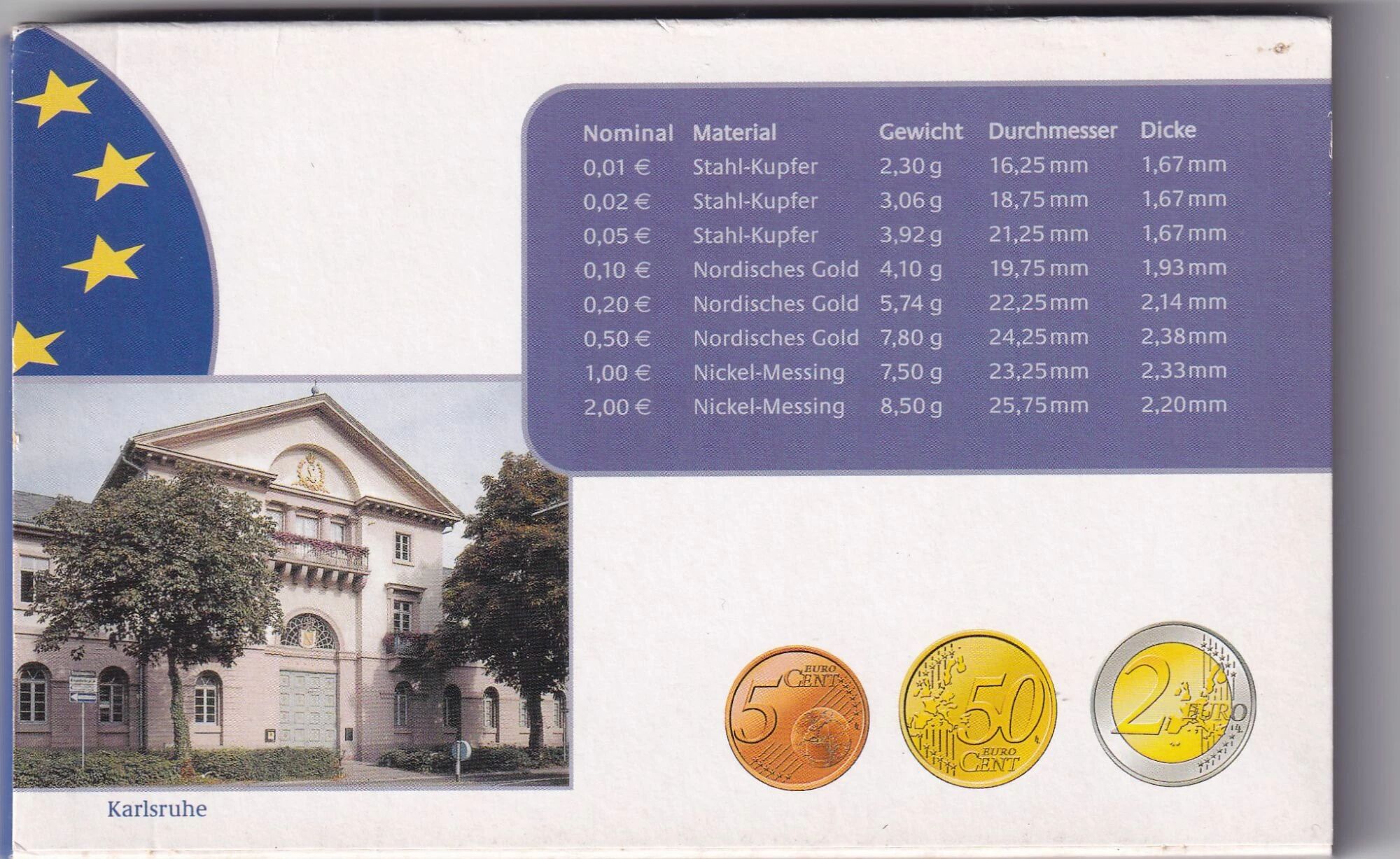 Each coin in the series has the standard characteristics of euro coins in circulation in Germany. The 1, 2, and 5 cent coins are made of copper-plated steel, displaying a motif of an oak branch, an iconic natural element of Germany. The 10, 20, and 50 cent coins are made of 'Nordic gold' alloy, representing the Brandenburg Gate in Berlin, a symbol of German reunification. The 1 and 2 euro coins are bimetallic. The 1 euro coin shows the federal eagle, another German national symbol. The 2 euro coin also features the federal eagle, but with the stars of the European Union.