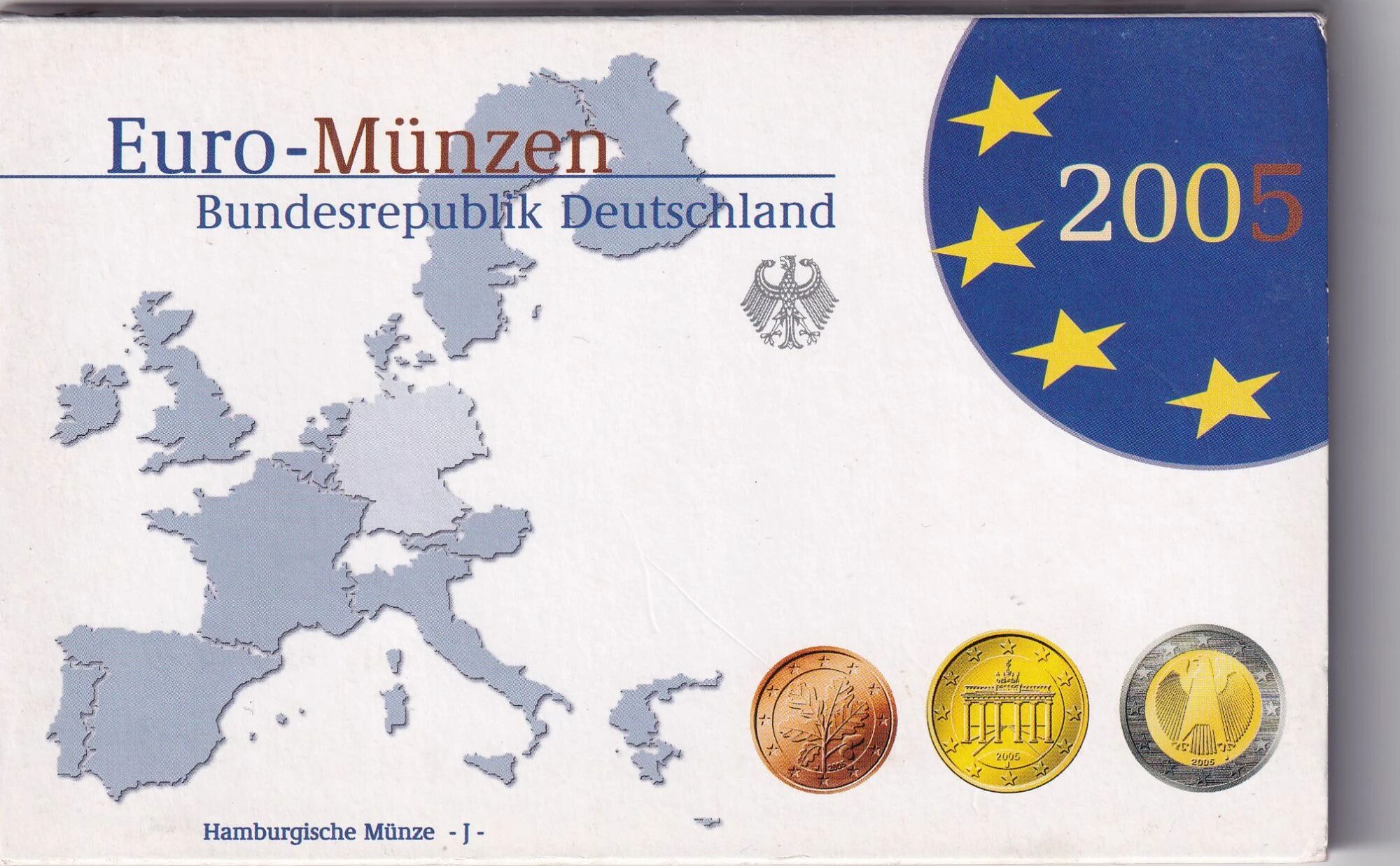 The mint is identified by the letter "J", indicating that the coins were produced in Hamburg. Each coin is designed according to the standardized technical specifications of the Eurozone. The 1, 2, and 5 cent coins are made of copper-plated steel, displaying a characteristic reddish color. The 10, 20, and 50 cent coins are made of "Nordic gold", an alloy of copper, aluminum, zinc, and tin, giving them a golden hue. The 1 and 2 euro coins are bimetallic; the 1 euro coin combines a cupro-nickel center and a brass-nickel ring, while the 2 euro coin reverses this composition, with a brass-nickel center and a cupro-nickel ring.