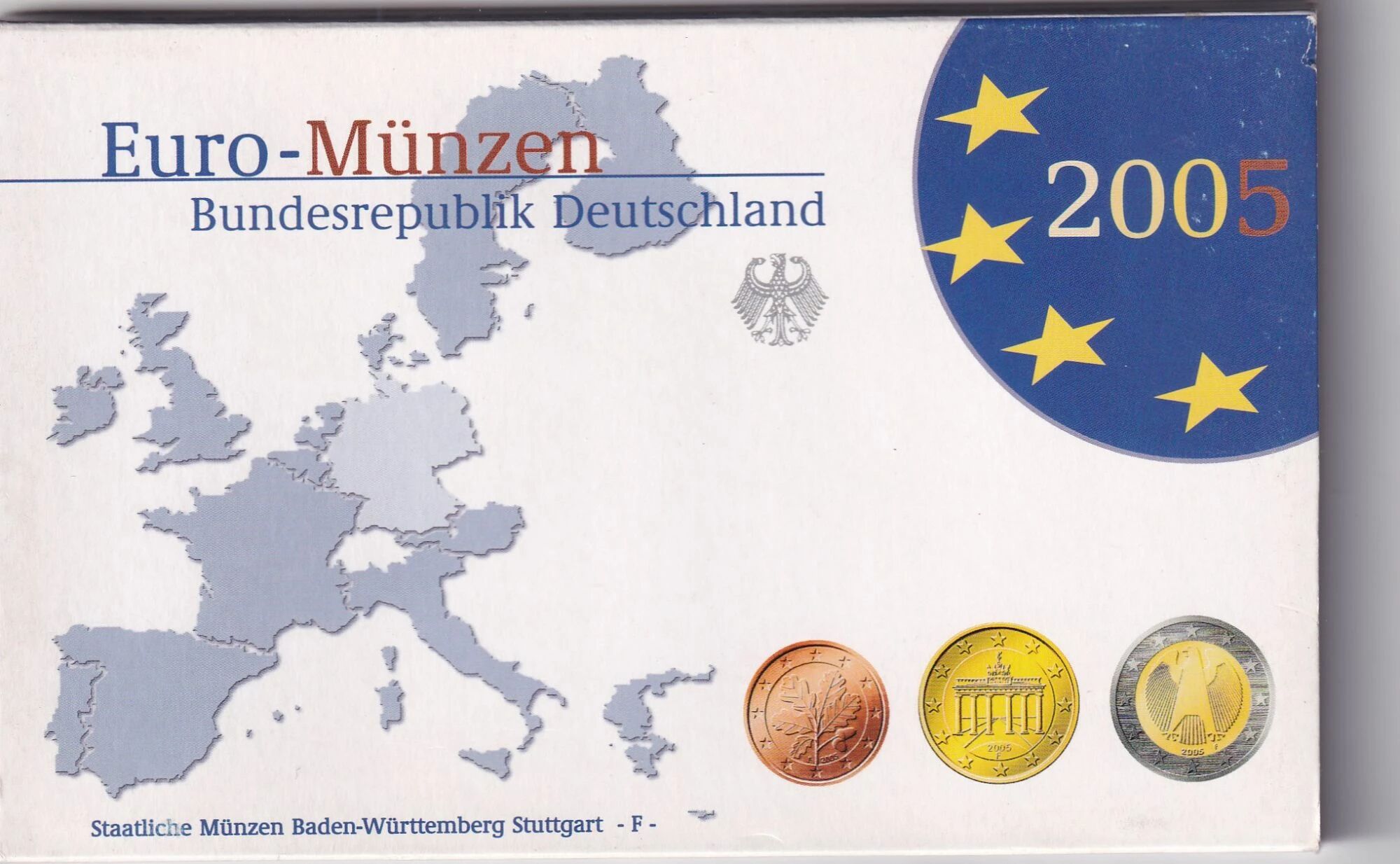 This numismatic set commemorates the year 2005 and includes all the euro circulation coins issued by Germany, from 1 cent to 2 euros.