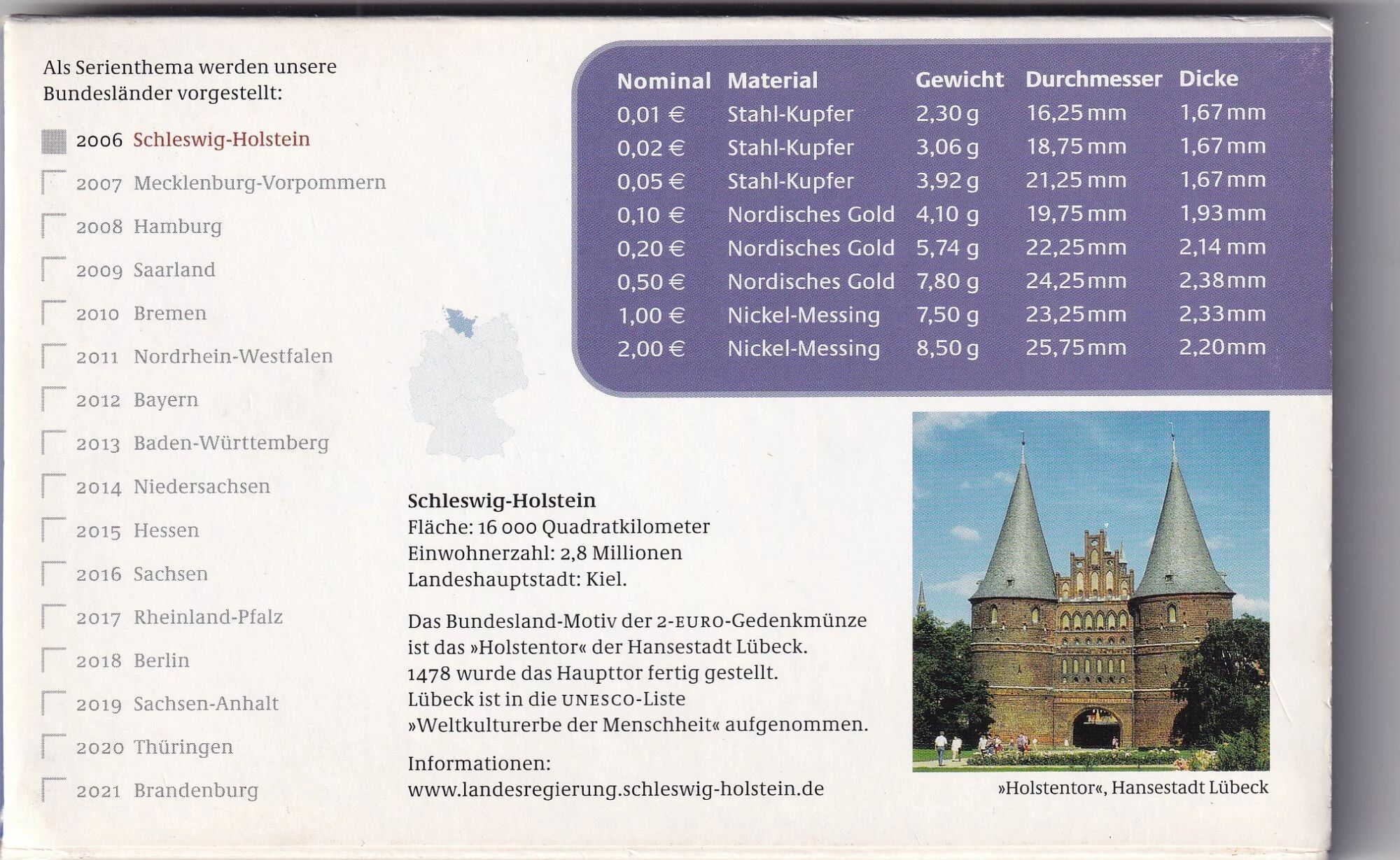 Each coin in this set features the national designs specific to Germany, while respecting the technical characteristics common to all euro coins: diameter, weight, metal composition. The 1, 2 and 5 cent coins are generally made of copper-plated steel, the 10, 20 and 50 cent coins are made of "Nordic gold", and the 1 and 2 euro coins are bimetallic.