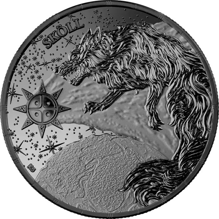 Sköll and his brother Hati are descendants of the mighty Fenrir. On the obverse, Sköll chases the Sun in the sky... capturing the star will be the beginning of the end, soon the world will be plunged into darkness. The reverse, meanwhile, features the symbol of the Sun and a double-headed eagle, the coat of arms of Germania Mint.