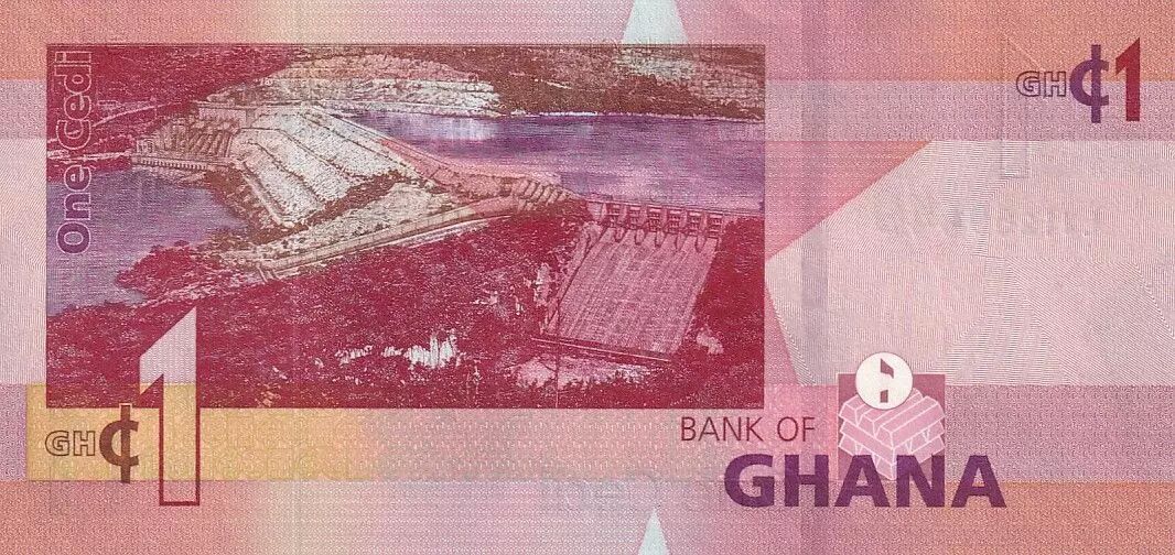 The reverse of the note highlights the Akosombo Dam, an important engineering structure for Ghana, located in the center left of the composition.
