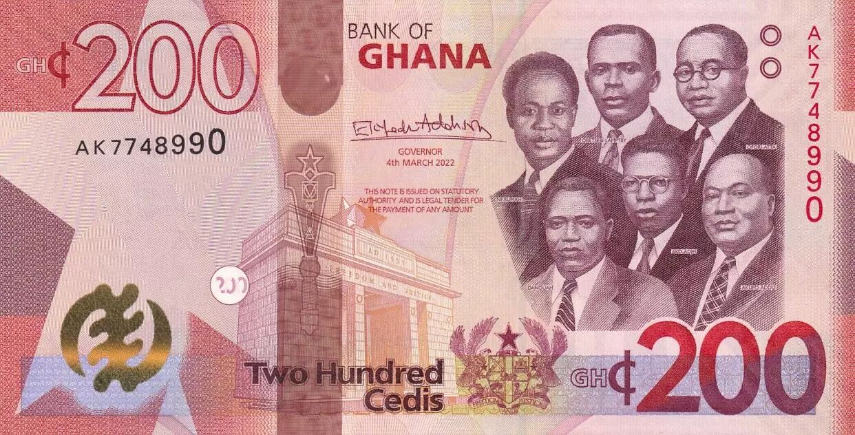 The 200 Ghanaian cedi banknote, issued in 2022, is part of the AK series. This commemorative banknote honors six prominent figures in Ghana's history, whose busts are aligned on the right side of the obverse. These individuals include Kwame Nkrumah, Ebenezer Ako-Adjei, Edward Akufo-Addo, Joseph Boakye Danquah, Emmanuel Obetsebi-Lamptey, and William Ofori Atta.