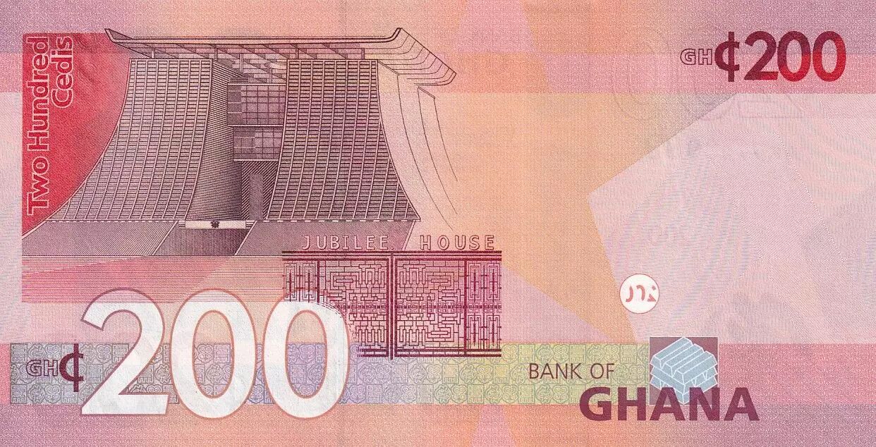 The reverse of the banknote features Jubilee House, an important government building, located on the center left. The face value "TWO HUNDRED CEDIS" is repeated, accompanied by the name of the issuing bank, "BANK OF GHANA". The inscription "JUBILEE HOUSE" clearly identifies the building depicted. The face value "GH¢200" is also present on the reverse. The banknote is printed by De La Rue, a company specializing in the printing of banknotes and security documents.