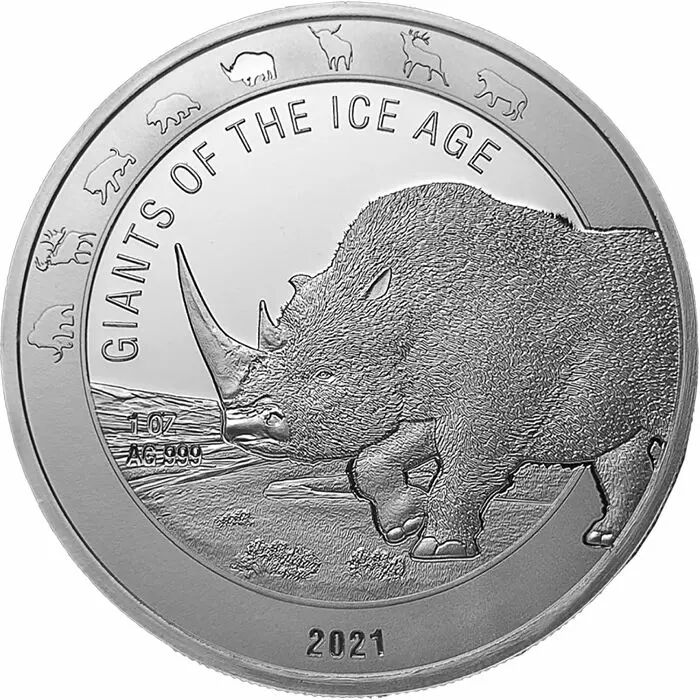 Pièce Ghana Rhinocéros laineux - 1 Once Argent Ghana 2021 - Les Géants de l'Age de Glace