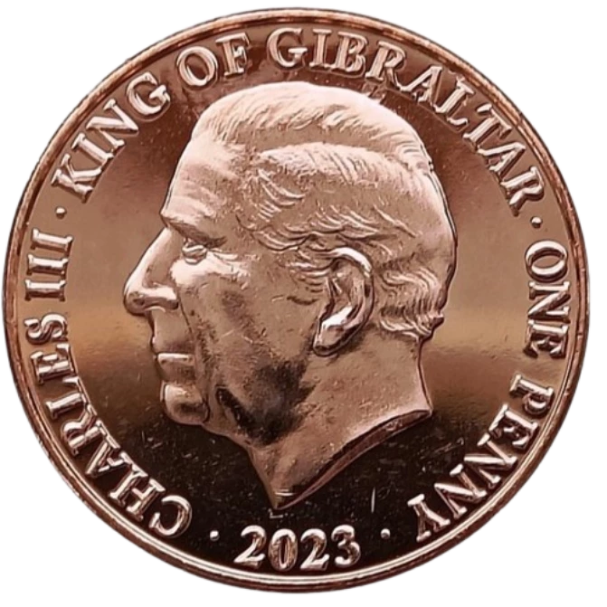 L'avers de la pièce arbore une tête non couronnée du roi Charles III, orientée vers la gauche. Une légende en latin entoure le portrait, incluant la dénomination de la pièce. La date d'émission, 2023, est inscrite en dessous du portrait. L'inscription complète est la suivante : CHARLES · III · KING OF GIBRALTAR · ONE PENNY · 2023 ·. Le graveur de cette face est Raphael David Maklouf.