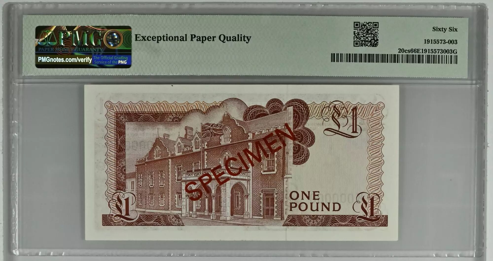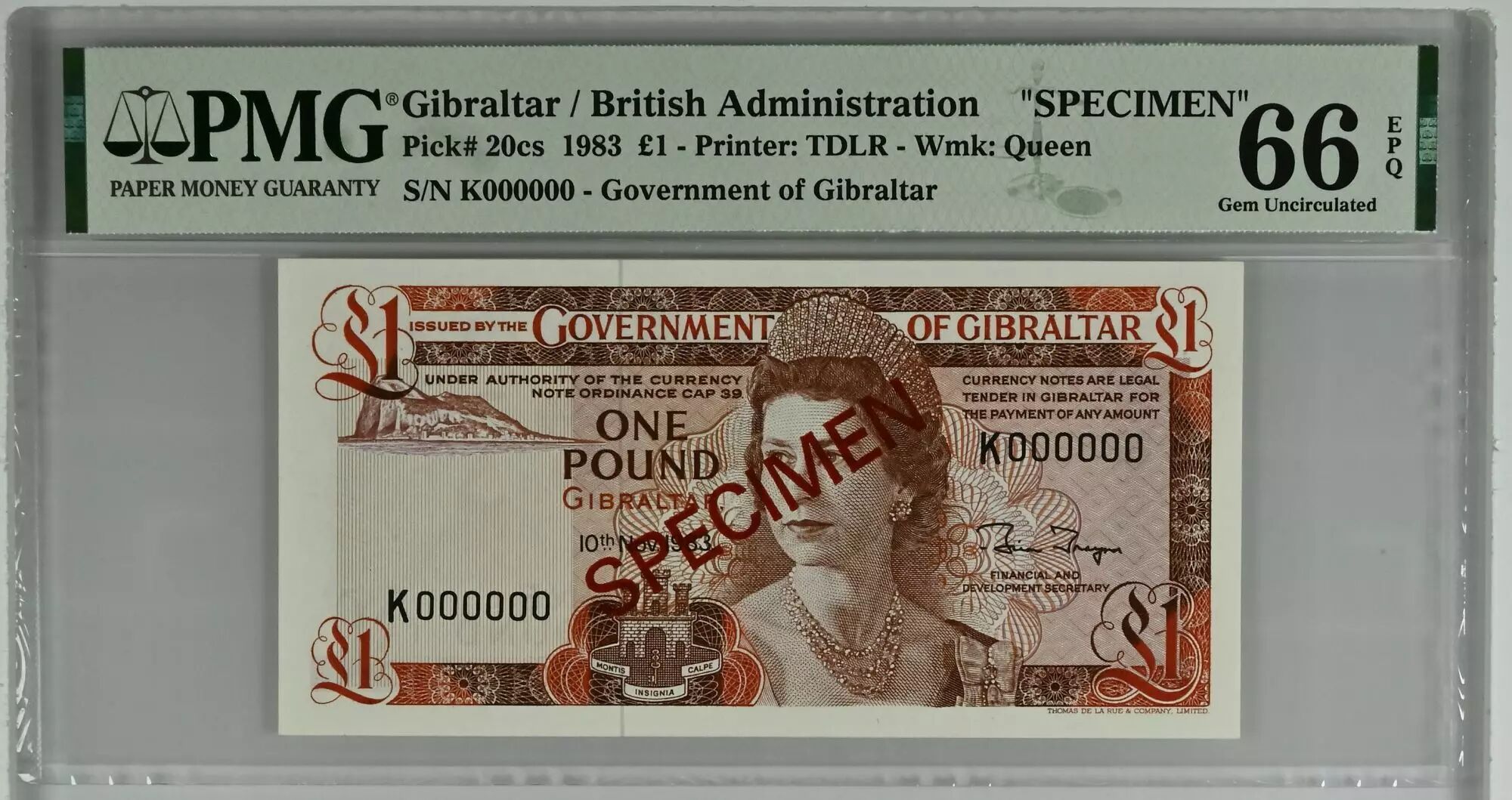 Accueil > Billets du Monde > Billets d'Europe > Gibraltar > Gibraltar 1 Pound Elisabeth II - 1983 - Specimen PMG 66 EPQ Série K000000