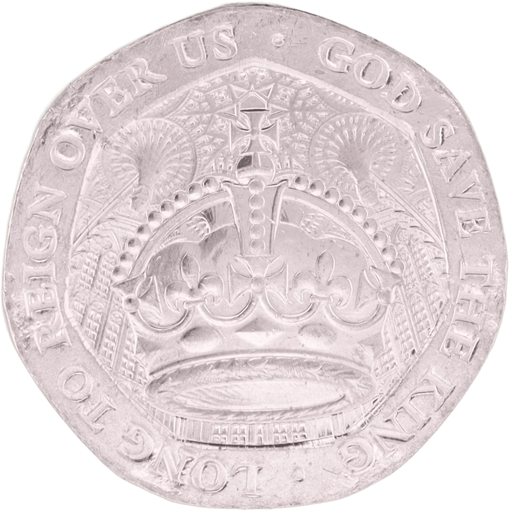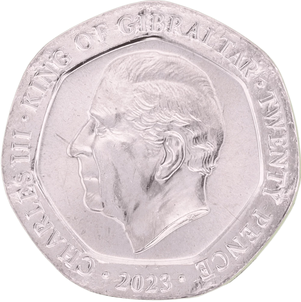 This coin is a 20 pence from Gibraltar, issued in 2023. It is struck in nickel-plated steel.
