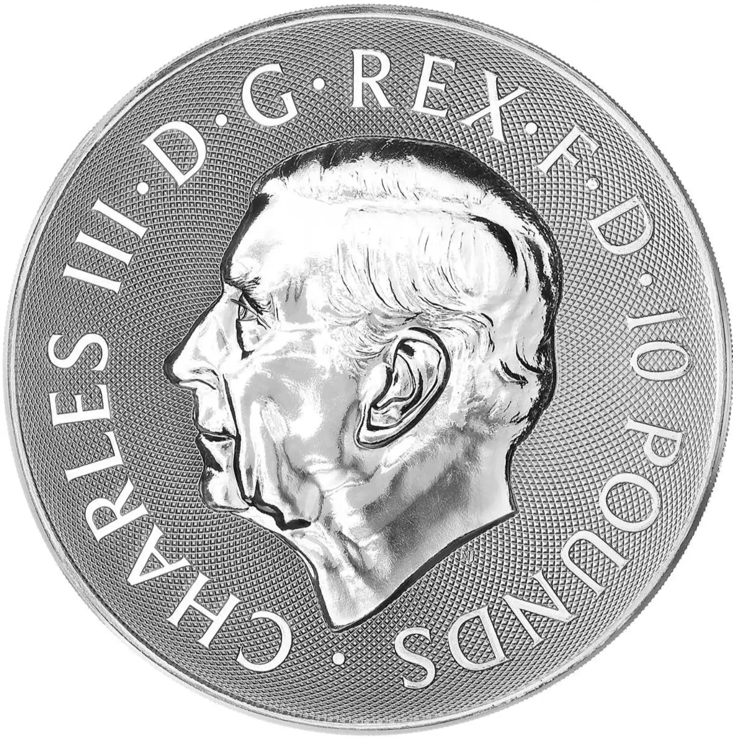 La valeur faciale de cette pièce est de 10 livres sterling (£ GBP). Sur l'avers, on trouve le portrait non couronné du roi Charles III, tourné vers la gauche. La légende autour du portrait est "CHARLES III·D·G·REX·F·D·10 POUNDS·" avec les initiales "MJ" du designer Martin Jennings. Cette légende est l'abréviation de "Charles III Dei Gratia Rex Fidei Defensor", qui signifie "Charles III, par la grâce de Dieu, roi, défenseur de la foi".