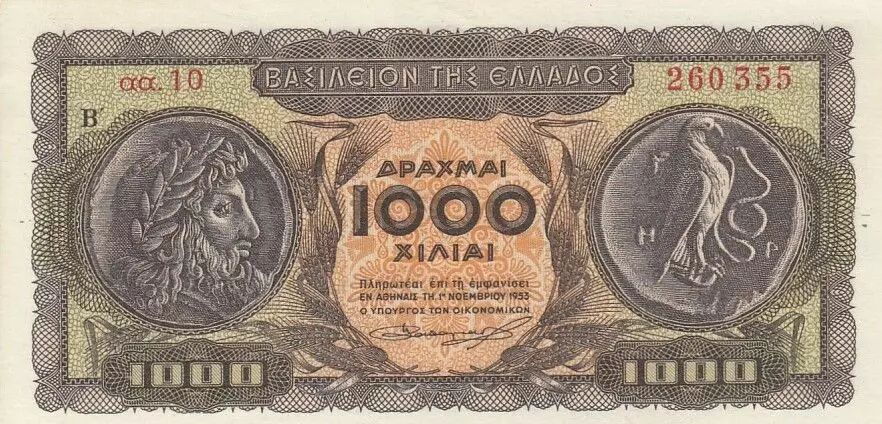 Accueil > Archivage > archivage-Billets du Monde > Grèce 1 000 Drachmes - Somolos - Série 260 355 - 1950