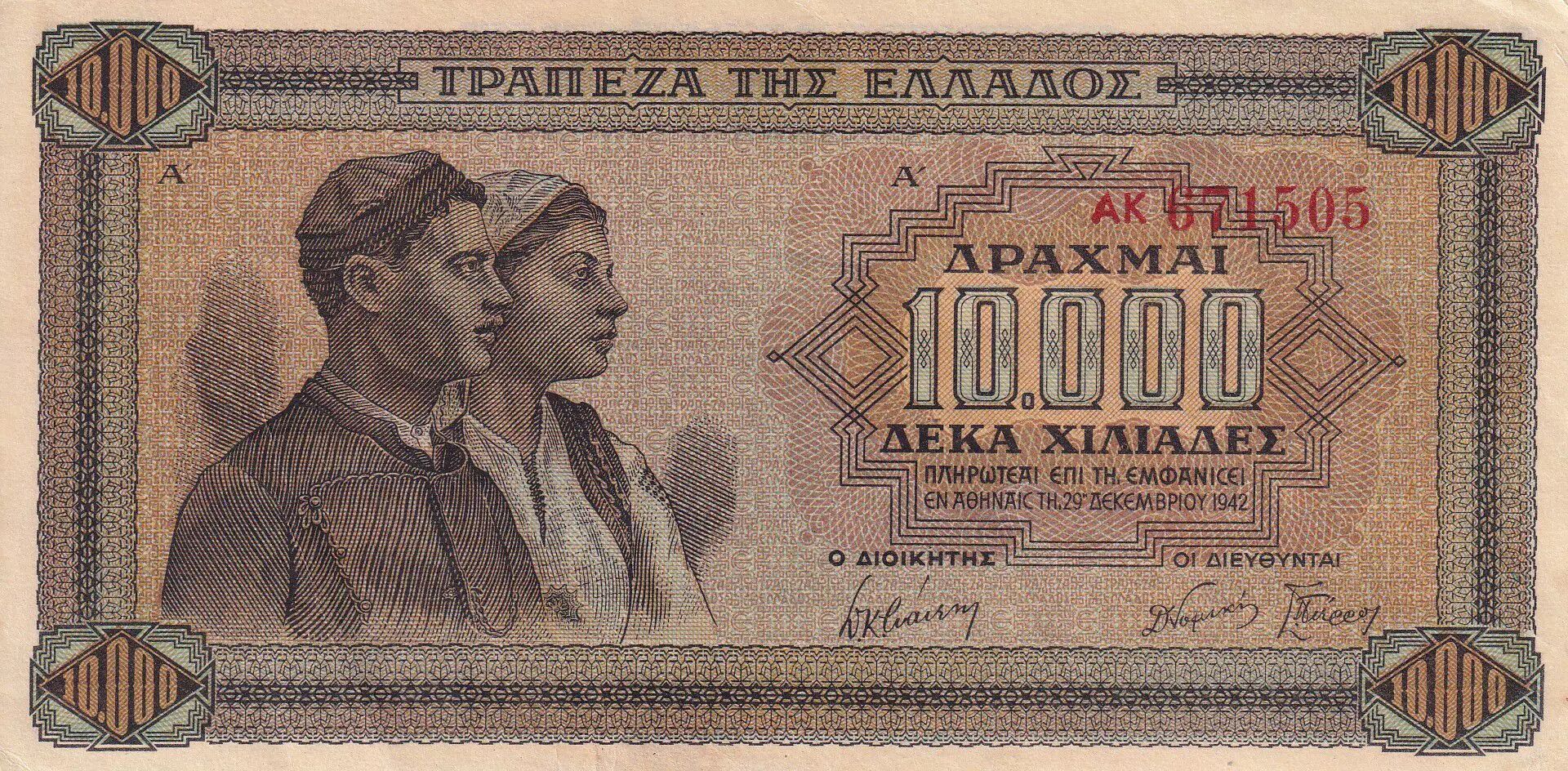 Accueil > Archivage > Grèce 10000 Drachms - Homme - Femme - Temple - 1942 - Série AK - SUP - P.120