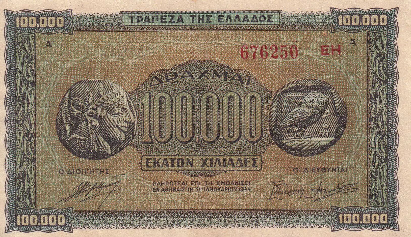 Billet Grèce 100000 Drachms - Pièces - Parthénon - 1944 - Série EH - SUP - P.125b