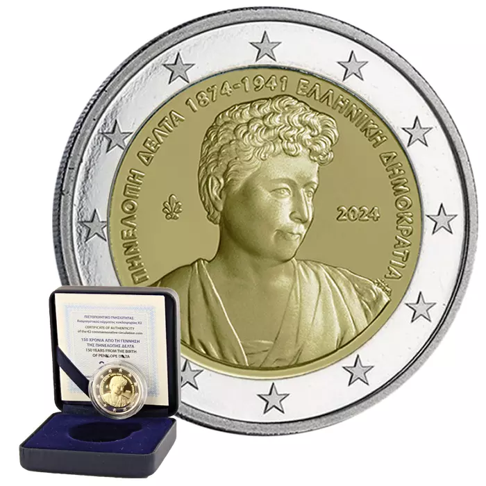 Portrait de la célèbre écrivaine grecque Pénélope Delta (1874 - 1941), regardant vers la droite. Au-dessus, on peut voir le motif et l'État d'émission "?HNE?O?H? ?E?TA 1874 - 1941 Ε??ΗÎΙΚΗ ?ΗΜΟΚΡΑΤΙΑ". Sur le bord gauche de l'image figure la palmette de l'atelier de frappe grec et sur le bord droit, le millésime "2024" ; à droite, en bas du portrait, on peut voir l'abréviation "?TAM" du créateur de la monnaie.